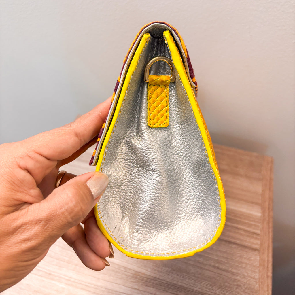 Gorgeous combination of happy in a practical handbag that travels with you to magical places. The rich mola with geometric pattern Isa gorgeous contrast of earth and sand. Must have piece in your wardrobe for a statement and a conversation starter.